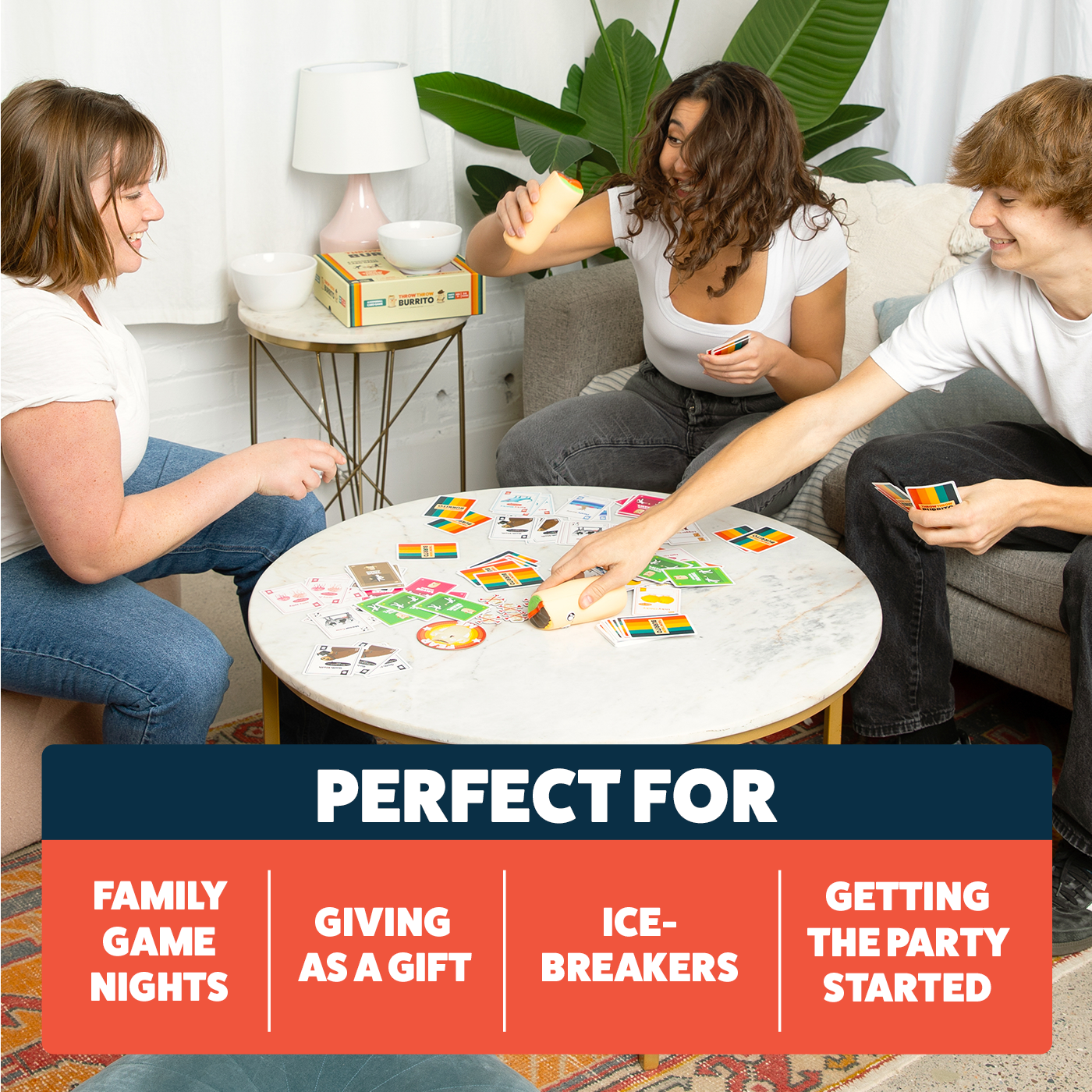 Place the pair of throwable Burritos on the table and deal out the cards. Earn points by collecting three of a kind. Play Burrito Cards and force your friends to battle. Duel to determine the winner. Duck, dodge and dive squishy, airborne burritos or get hit and receive a Burrito Bruise!